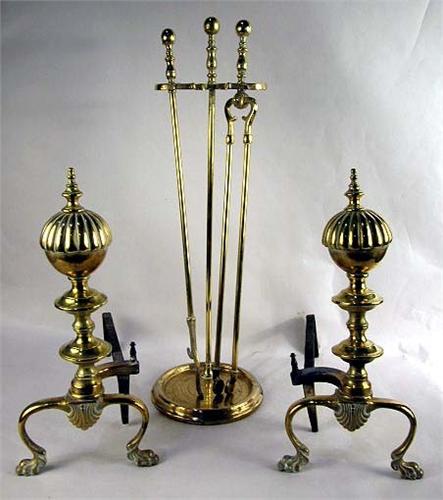 A PAIR OF CAST BRASS AND WROUGHT IRON ANDIRONS; Together with a cast brass poker and tongs 4 pieces 19"h x 9"w x 17 1/2"l