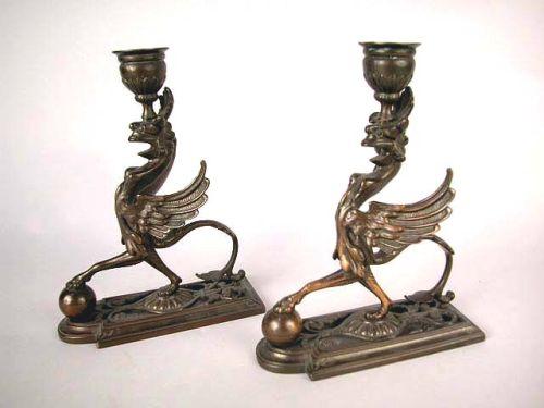 A PAIR OF CAST BRASS CANDLESTICKS, GERMAN; Featuring winged dragons, marked "W.T. & S." with a sun symbol and "562" 7.5"h
