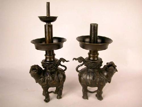 A PAIR OF CAST BRONZE FIGURAL PRICKET CANDLESTICKS. CHINESE; 13"h and 16"h