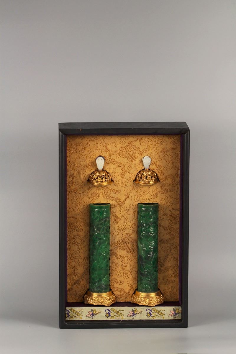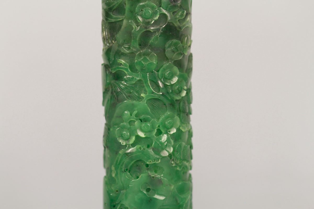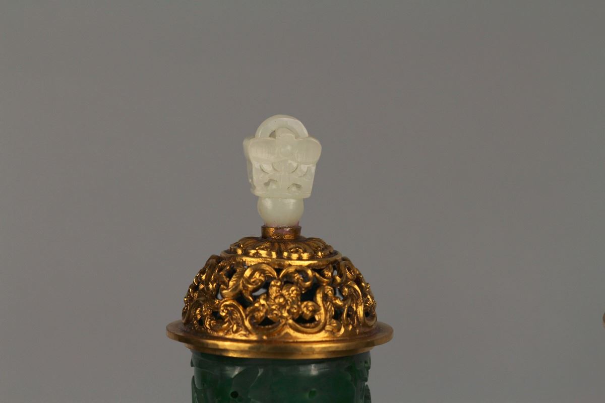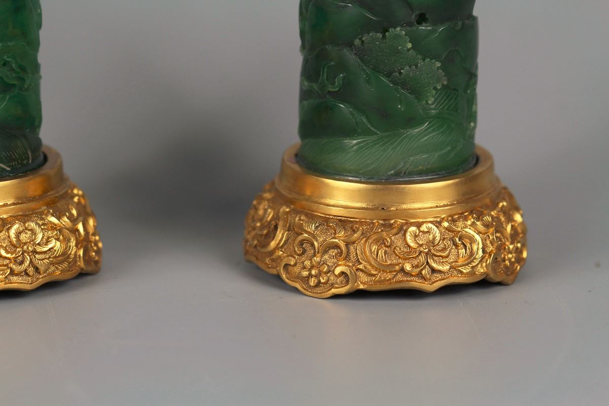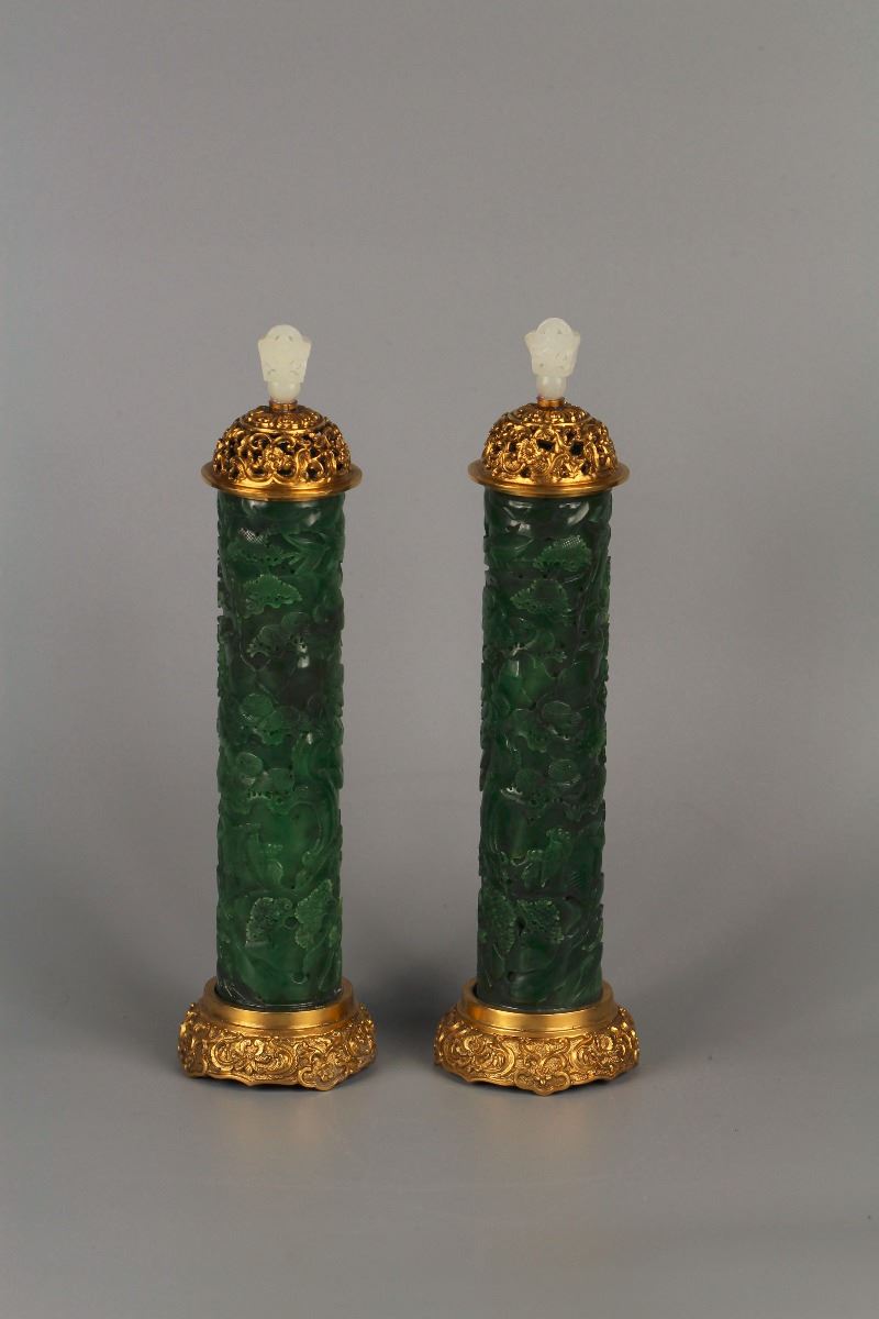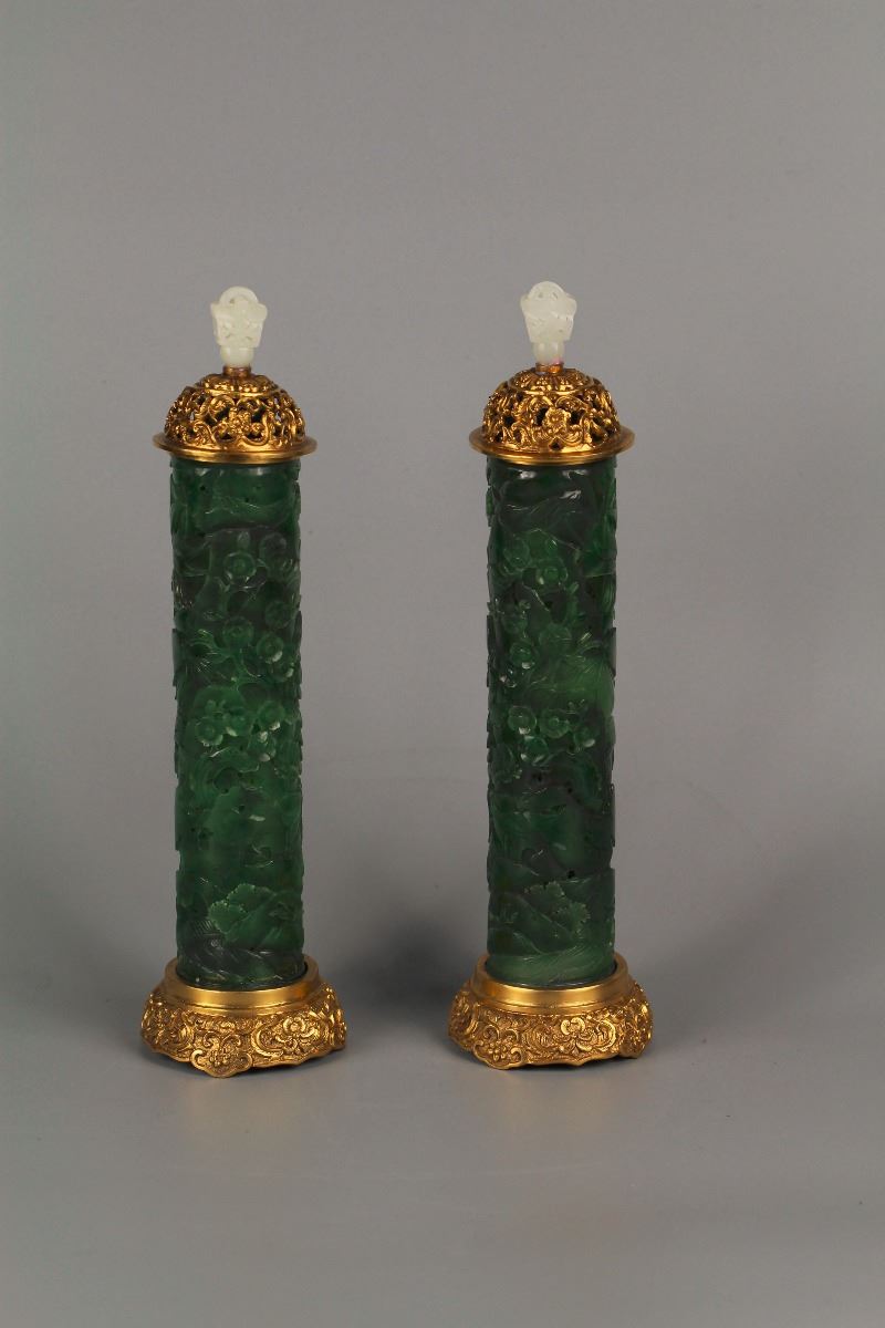 A pair of delicate censer tubes, each carved from one piece of jade with relief of landscape and figural detailing, the caps with openwork and bases carved with top craftmanship. Height 9.5" Diameter 1.5"