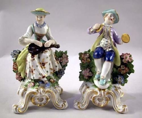 A PAIR OF CHELSEA PORCELAIN FIGURAL GROUPS; 10" x 3"