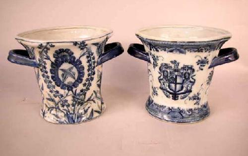 A PAIR OF CHINESE BLUE AND WHITE HANDLED POTS; 6-1/2"h