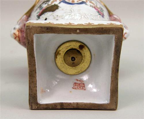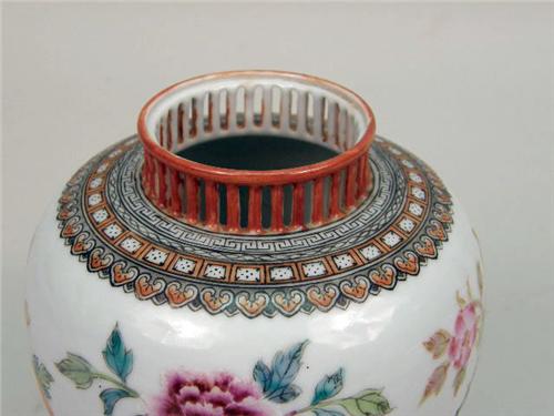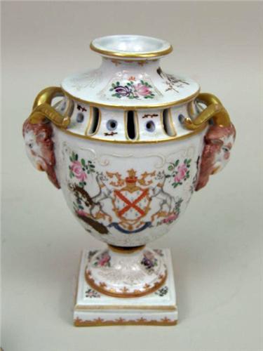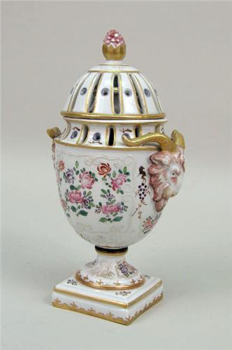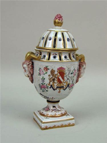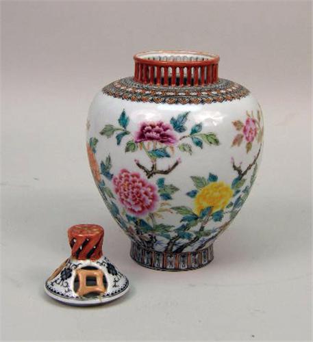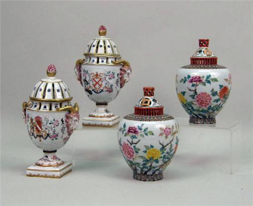 Witha floral motif, and having ram head handles. Together with a pair of Japanese porcelain baluster-form covered jars, reticulated rim, floral motif. 4 pieces.