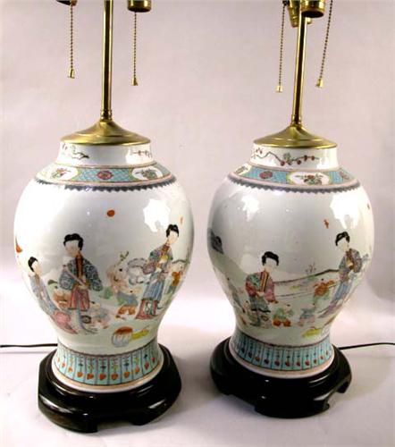 A PAIR OF CHINESE STYLE GINGER JAR PORCELAIN LAMPS; In tones of green and blue on a white ground, 28"h