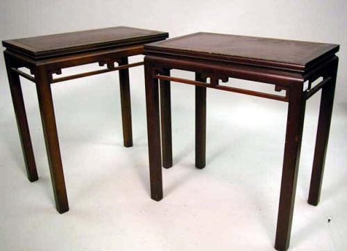A PAIR OF CHINESE-STYLE LEATHER-INSET MAHOGANY SIDE TABLES; Together with a circular mahoganized plant stand and a Queen Anne style oval low table, wear, four pieces