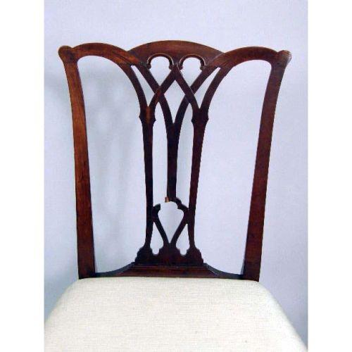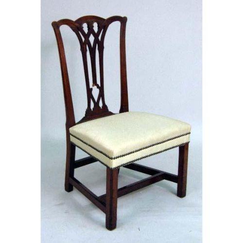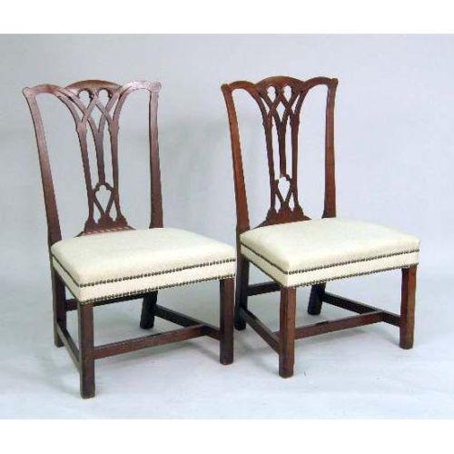 A PAIR OF CHIPPENDALE CARVED CHERRYWOOD SIDE CHAIRS<BR><BR>Probably Connecticut, Chapin school, losses, splats possibly of a later date, possibly reduced in heights, lacks casters, 36"h