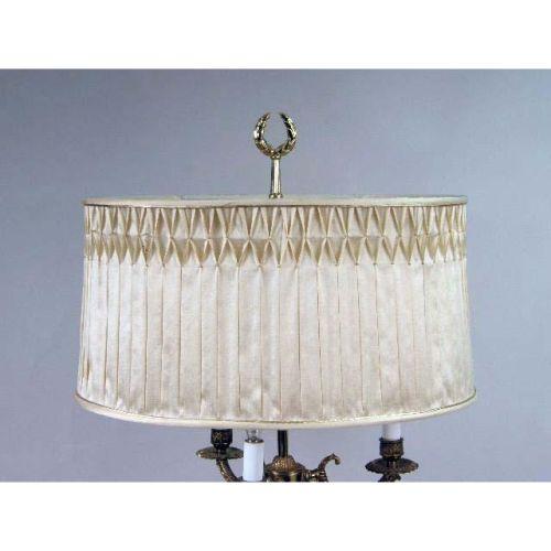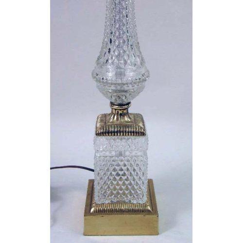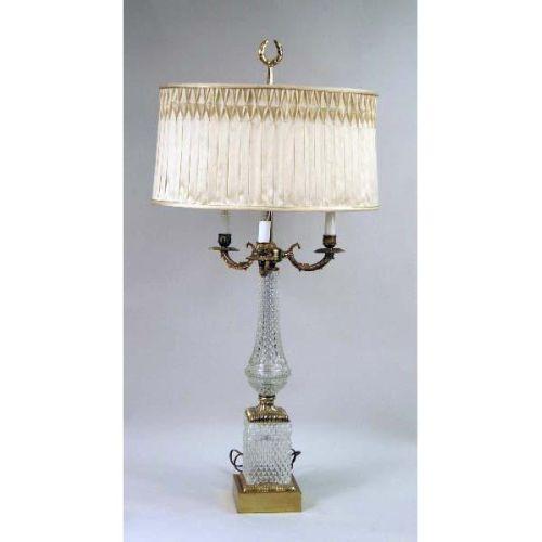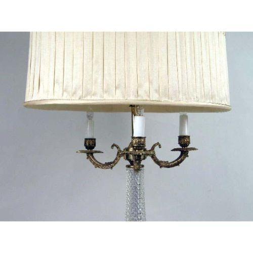 A PAIR OF COLORLESS GLASS AND GILT-DECORATED THREE-ARM TABLE LAMPS<BR><BR>22"h, losses
