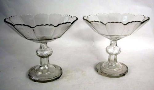 A PAIR OF COLORLESS GLASS FOOTED COMPOTES; Scalloped form rim, each 8"h
