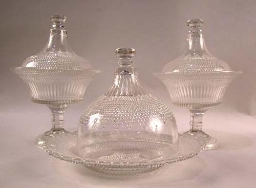 A PAIR OF COLORLESS GLASS FOOTED DIAMOND POINT COMPOTES; Together with a similar diamond point star pattern covered cake server