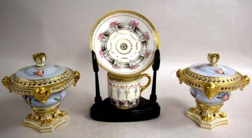 A PAIR OF CONTINENTAL POLYCHROME DECORATED CACHE POTS; (losses and repairs) Together with a cup and saucer (repairs)