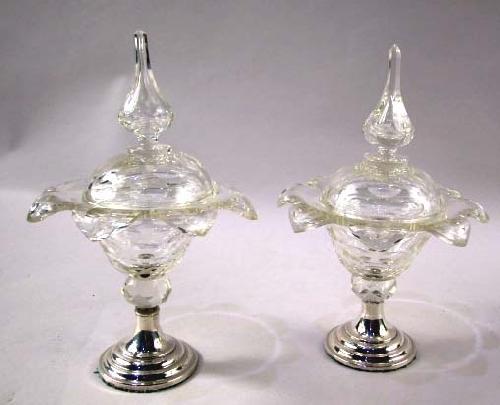 A PAIR OF COVERED GLASS COMPOTES WITH SILVER BASE; 9"h