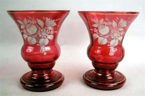 A PAIR OF CRANBERRY FLORAL ENAMEL-DECORATED VASES; 6 1/2"h