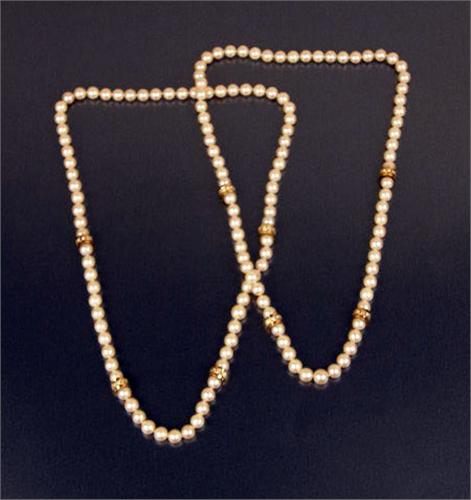 <b>A PAIR OF CULTURED PEARL NECKLACES WITH DIAMOND-SET 18K YELLOW GOLD RONDELS</b>