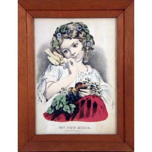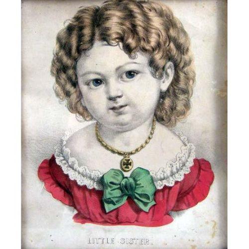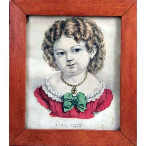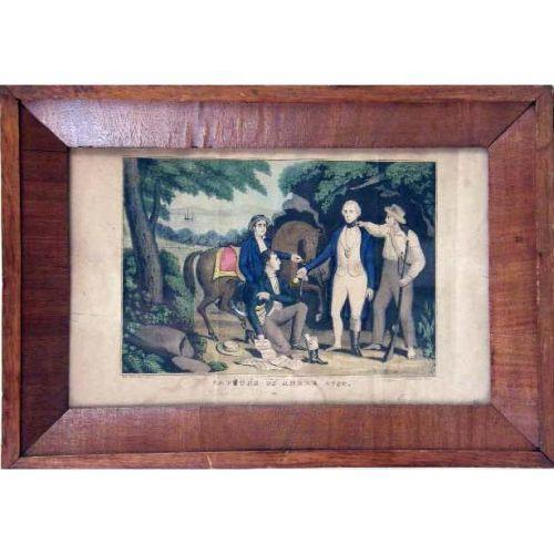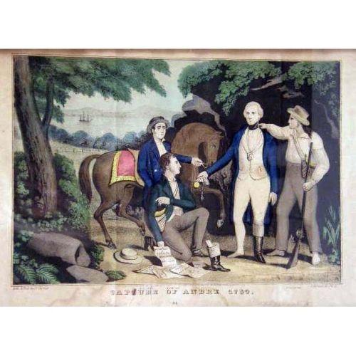 A PAIR OF CURRIER & IVES HAND-COLORED PRINTS<BR><BR>Depicting young girls, titled "My Pet Bird" and "Little Sister", framed, size of largest, 13"h x 9-1/2"w, and N. Currier hand-colored print "Capture of Andre 1780", in mahogany frame, 9-1/2"h x 14"w