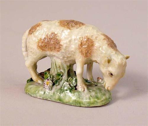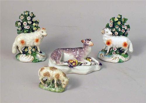 Together with a Derby figure of a reclining deer and a Meissen small figure of a sheep. All with some restoration. 4 pieces.