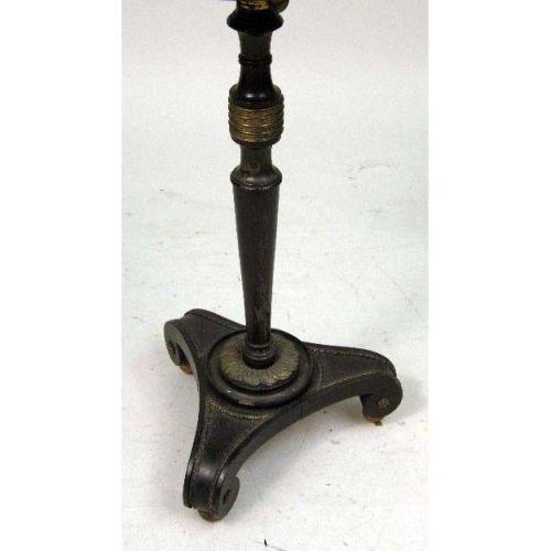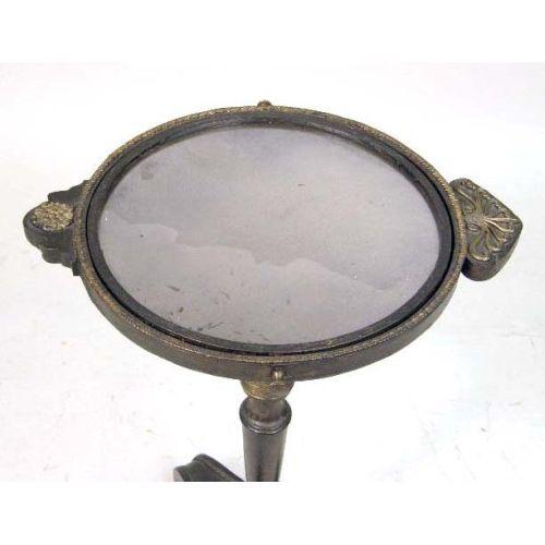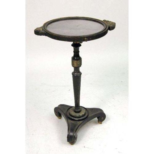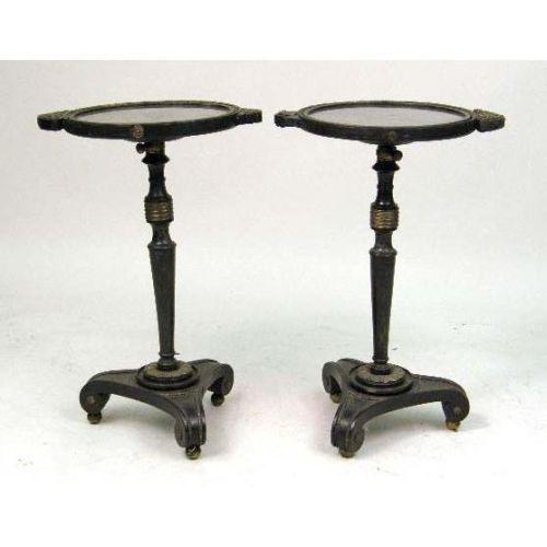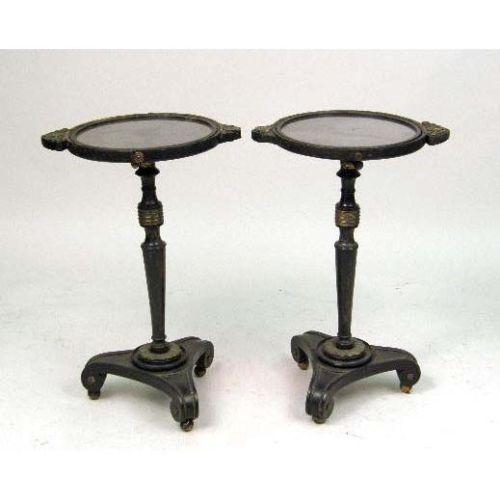 A PAIR OF EBONIZED AND GILT METAL MOUNTED REGENCY STYLE MIRRORED STANDS<BR><BR>Circular tops inset with mirror on a height adjusting standard resting on scrolled tripod base, 27"h x 14"dia.