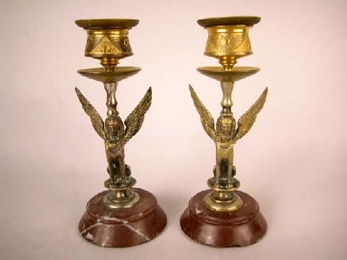 A PAIR OF EGYPTIAN REVIVAL BRASS CANDLESTICKS; on red marble bases, winged Sphinx figures with original bobeches 6/25"h