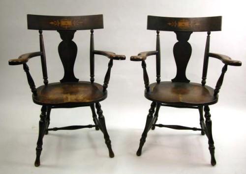 A PAIR OF EMPIRE STYLE RED-STAINED AND INLAID BIRCHWOOD TABLET-BACK WINDSOR ARMCHAIRS; American, with inlaid tablet-form backrest above a vasiform splat and ending on turned legs joined by stretchers (wear to surface and losses to veneer) 37"h Together with two similar walnut plant seat alpine chairs, with pierced backrests and tapering fluted legs, 34"h