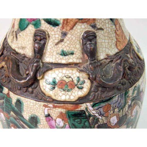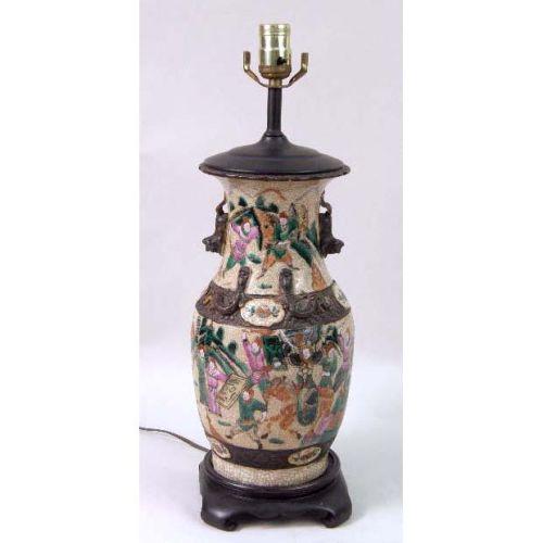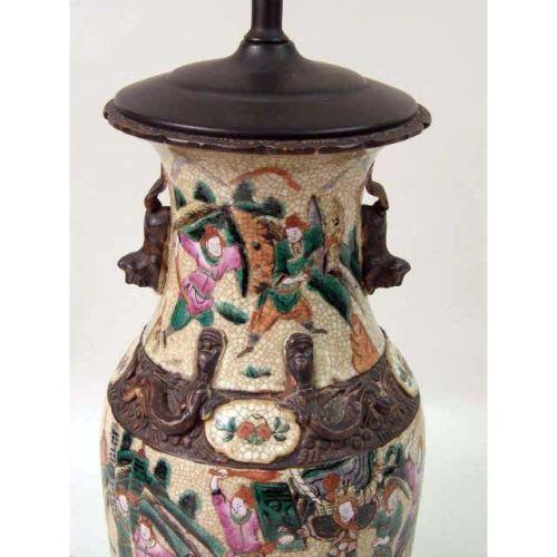 A PAIR OF ENAMEL-DECORATED POTTERY VASES<BR><BR>Chinese, now mounted as lamps, each of baluster form, decorated with numerous figures on a crackle-glazed tan ground, 32"h overall