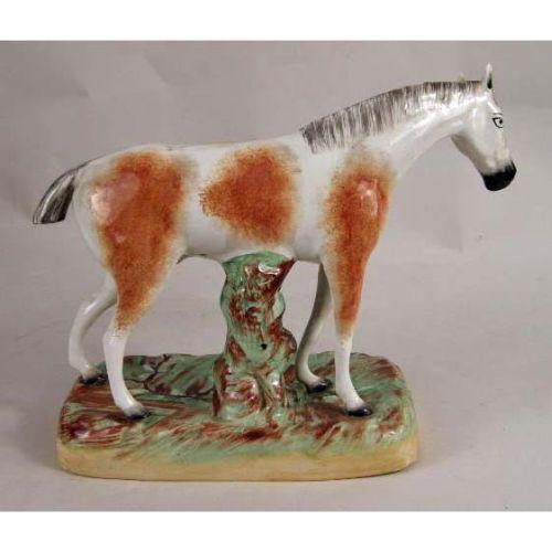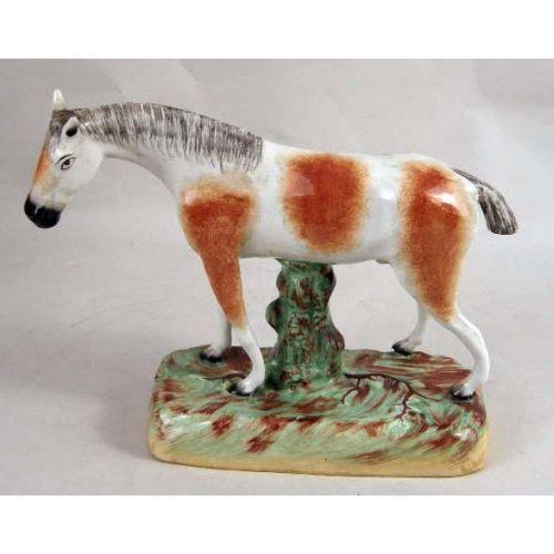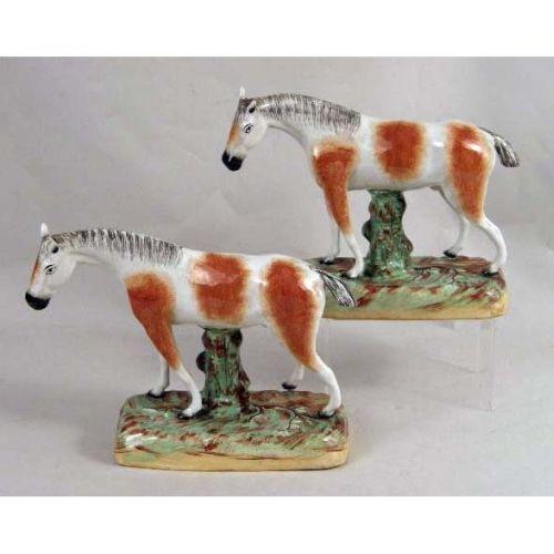 A PAIR OF ENGLISH STAFFORDSHIRE HORSE FIGURALS<BR><BR>Marked on base Old Staffordshire Ware, England, 9"h x 11"l
