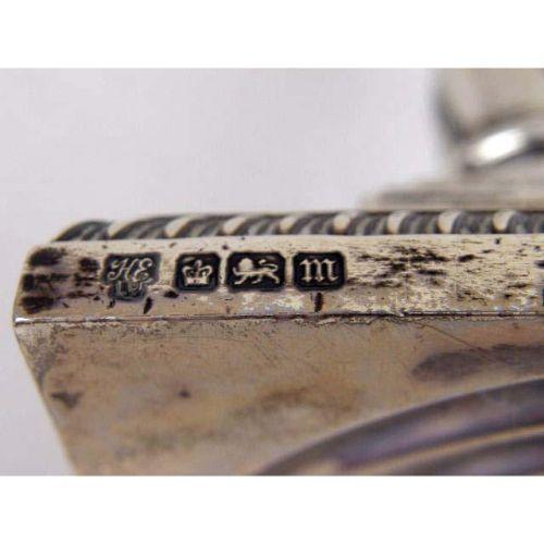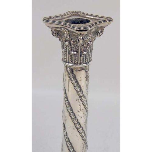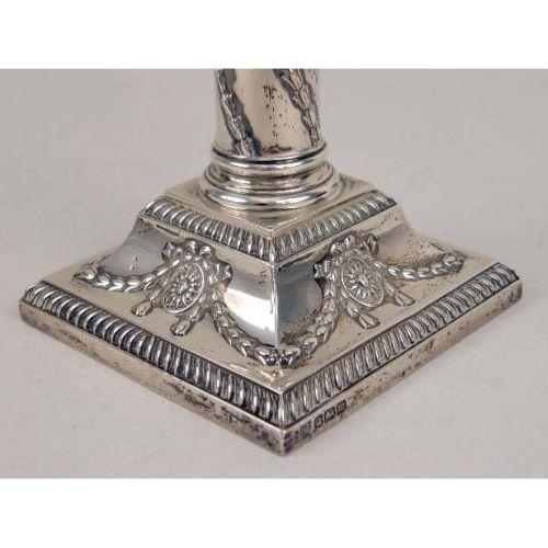 A PAIR OF ENGLISH STERLING COLUMNAR SILVER CANDLESTICKS<BR><BR>Hallmarked HE L, Sheffield, 1904, with gadrooned borders, laurel garland and medallion motif, 9"high