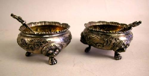 A PAIR OF ENGLISH STERLING SILVER MAPPIN & WEBB MASTER SALTS WITH SALT SPOONS, 2-1/4"dia., apx. 5 T.O.