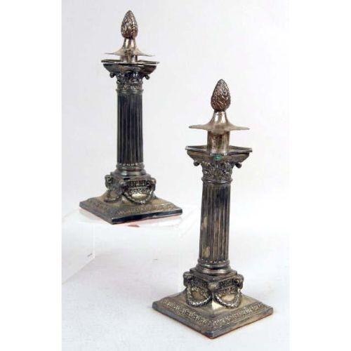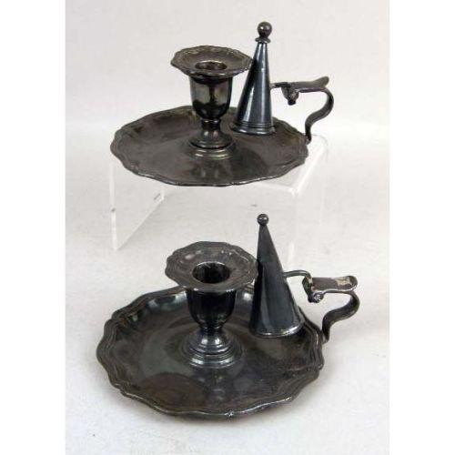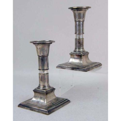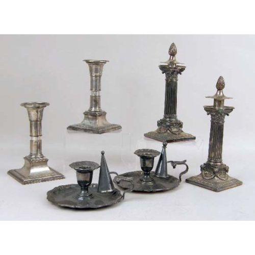 A PAIR OF ENGLISH STERLING SILVER TELESCOPIC CANDLESTICKS<BR><BR>Hallmarked TLDL, 6"h. Together with a pair of sterling silver weighted Adams style candlesticks with flame finials, 12"h, and a pair of silver on copper chambersticks each with candle snuffer
