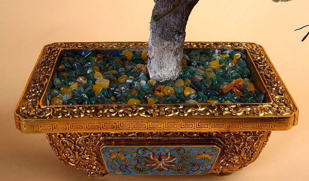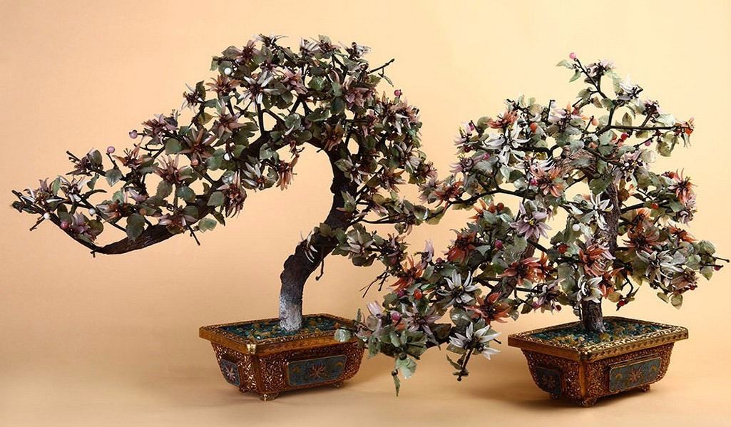 A pair of exquisite Chinese miniascapes in the form of Yu Lan flowe blossom, consist of multiple gems that represents happiness, gilt flower put enamelled with rectangluar panels on the sides and high relief foliage carvings on the exterior, bearing a incised four-character seal on the base. Width 22.75" Height 18.75"