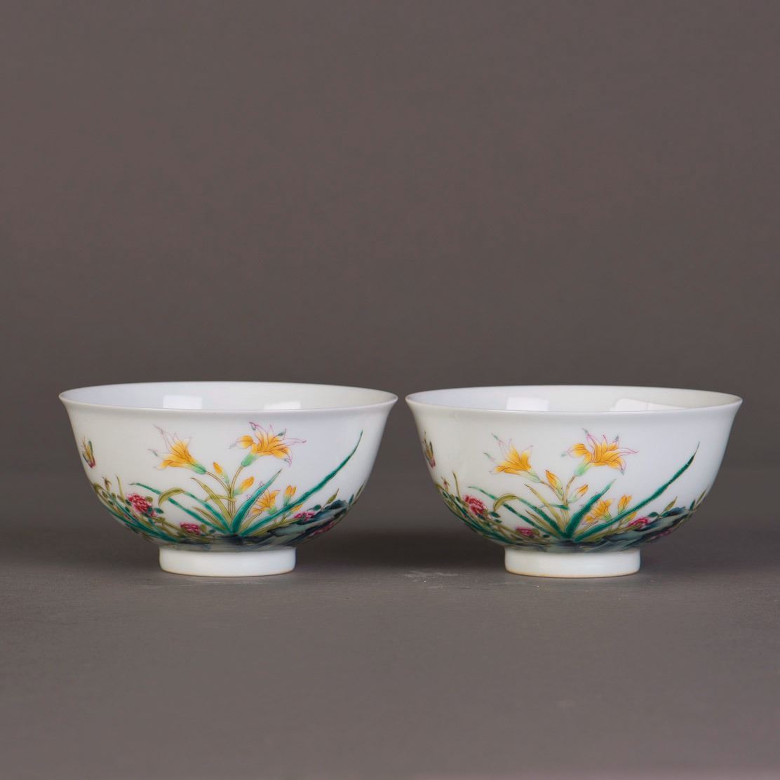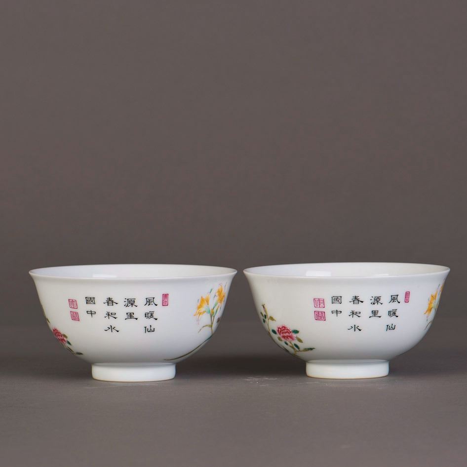 A pari of famille rose porcelain bowls stylised by a painting of butterflies and flowers on the exterior, sealed and inscribed with calligraphy verses, bearing a six-character seal on the base. Height 2.25" Diameter 4.75"
