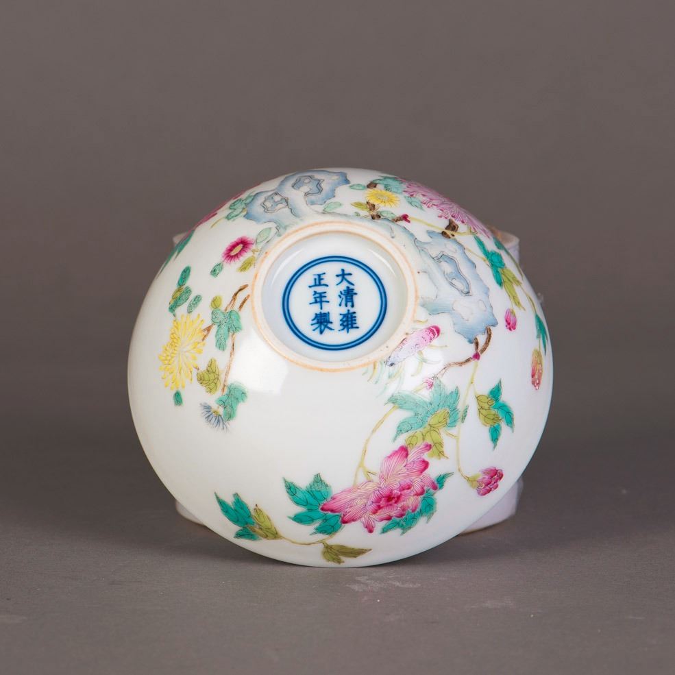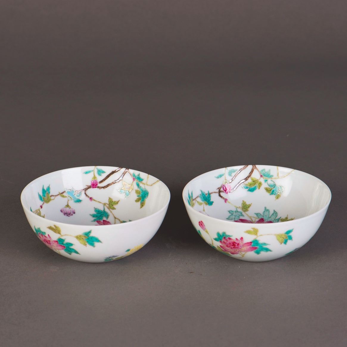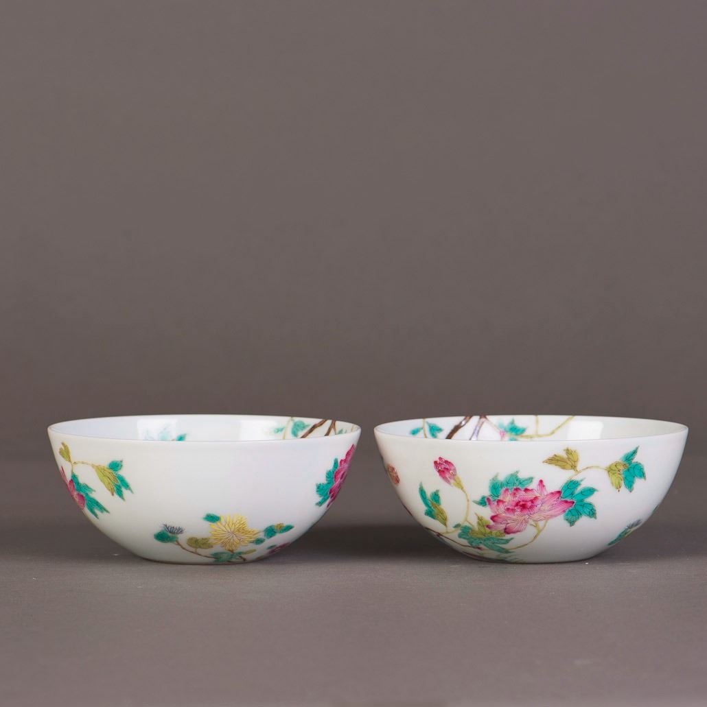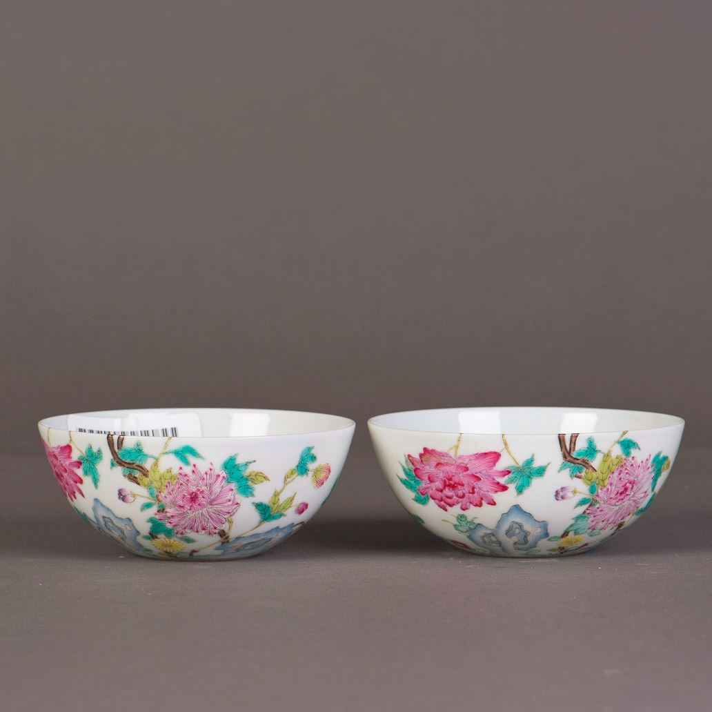 A pair of famille rose porcelain bowls, decorated with floral paintings on the exterior and interior, bearing a six-character seal on the base. Height 1.75" Diameter 4.5"