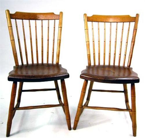 A PAIR OF FAUX-BAMBOO TURNED WINDSOR THUMB-BACK SIDE CHAIRS; With stepped crest above turned spindles, the plank seat below on "bamboo" turned legs joined by stretchers (each lacks paint and average wear) 32"h