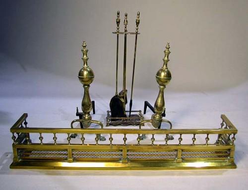 A PAIR OF FEDERAL STYLE CAST BRASS AND WROUGHT IRON ANDIRONS; Together with a brass fender and a similar group of fire tools, comprising a poker, shovel, tongs and stand 7 pieces Andirons: 23"h x 8 1/2"w x 17"d Fender: 8"h x 43"w x 8 1/2"d