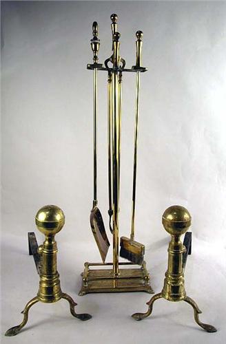 A PAIR OF FEDERAL STYLE CAST BRASS AND WROUGHT IRON ANDIRONS; Murdock Parlor Grate Co., Boston, Together with a miscellaneous group of firetools, Comprising a stand, broom, tongs, and shovel 6 pieces 14"h x 9"w x 20"d