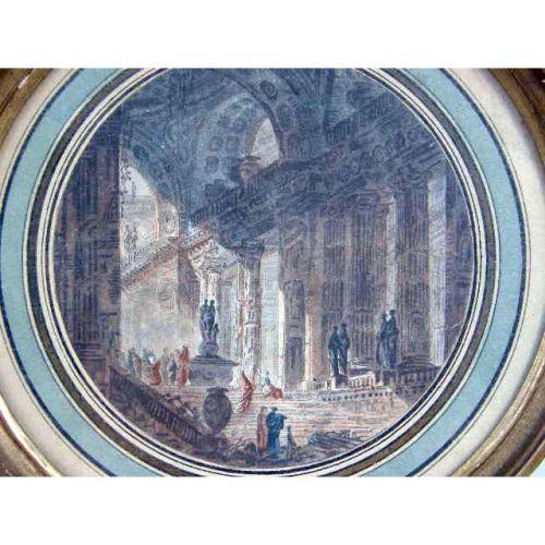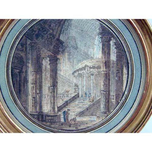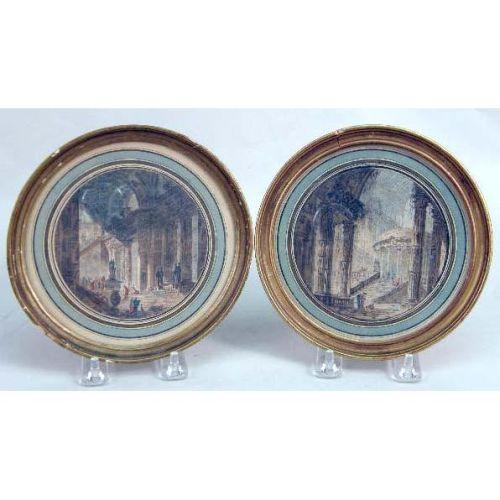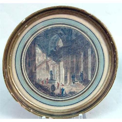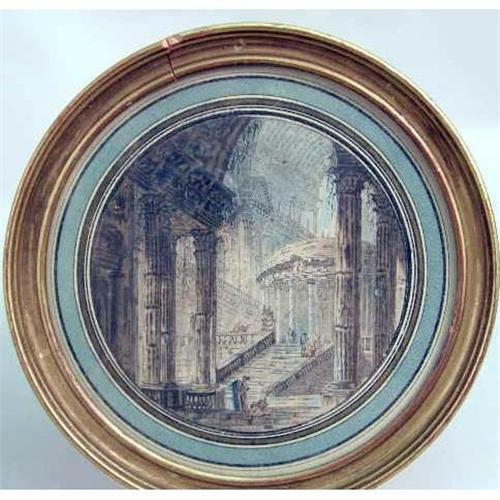 A PAIR OF FRAMED CIRCULAR WATERCOLORS<BR><BR>Depicting classical architectural scenes, attributed to Hubbard