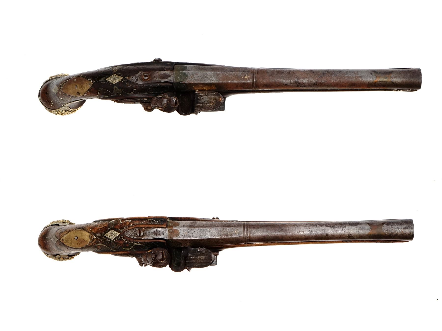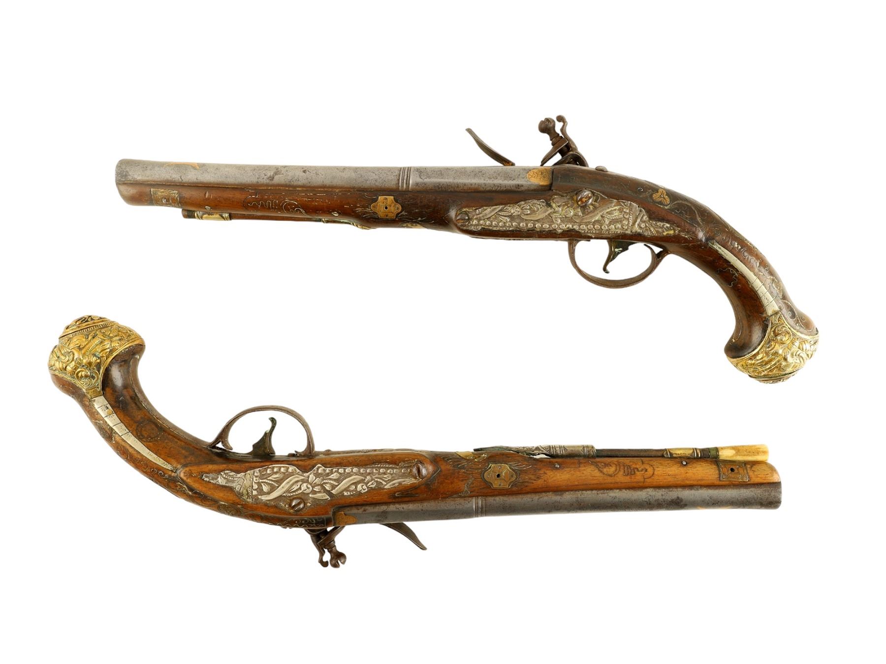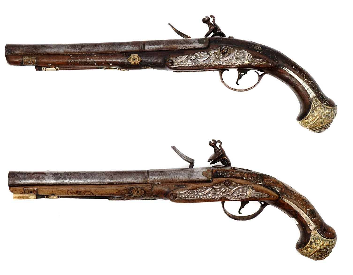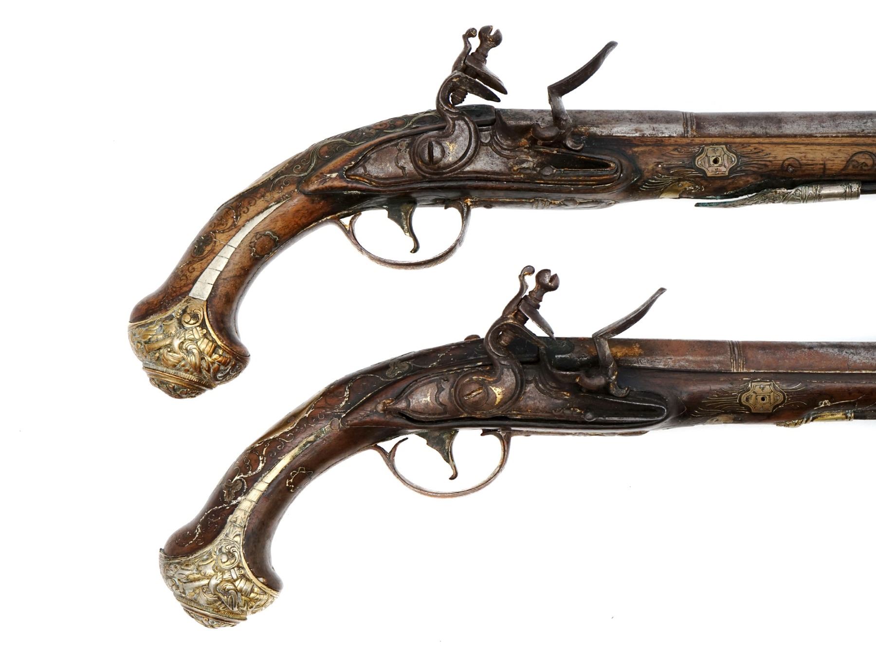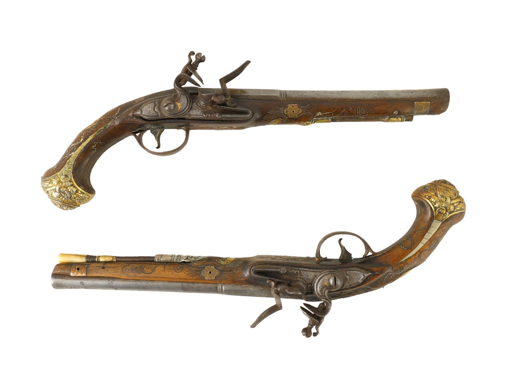 A pair of French flintlock pistols with round smoothbore barrel app. 18 mm cal. The octagonal breech part is inlaid with brass. The lockplates and triggers are decorated with fire gilt. The mounts are made of hammered and engraved brass. The stocks are decorated with brass inlay.