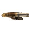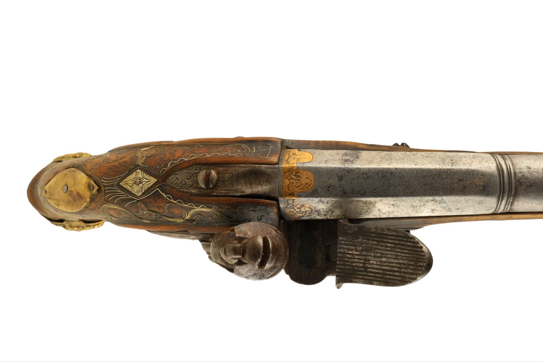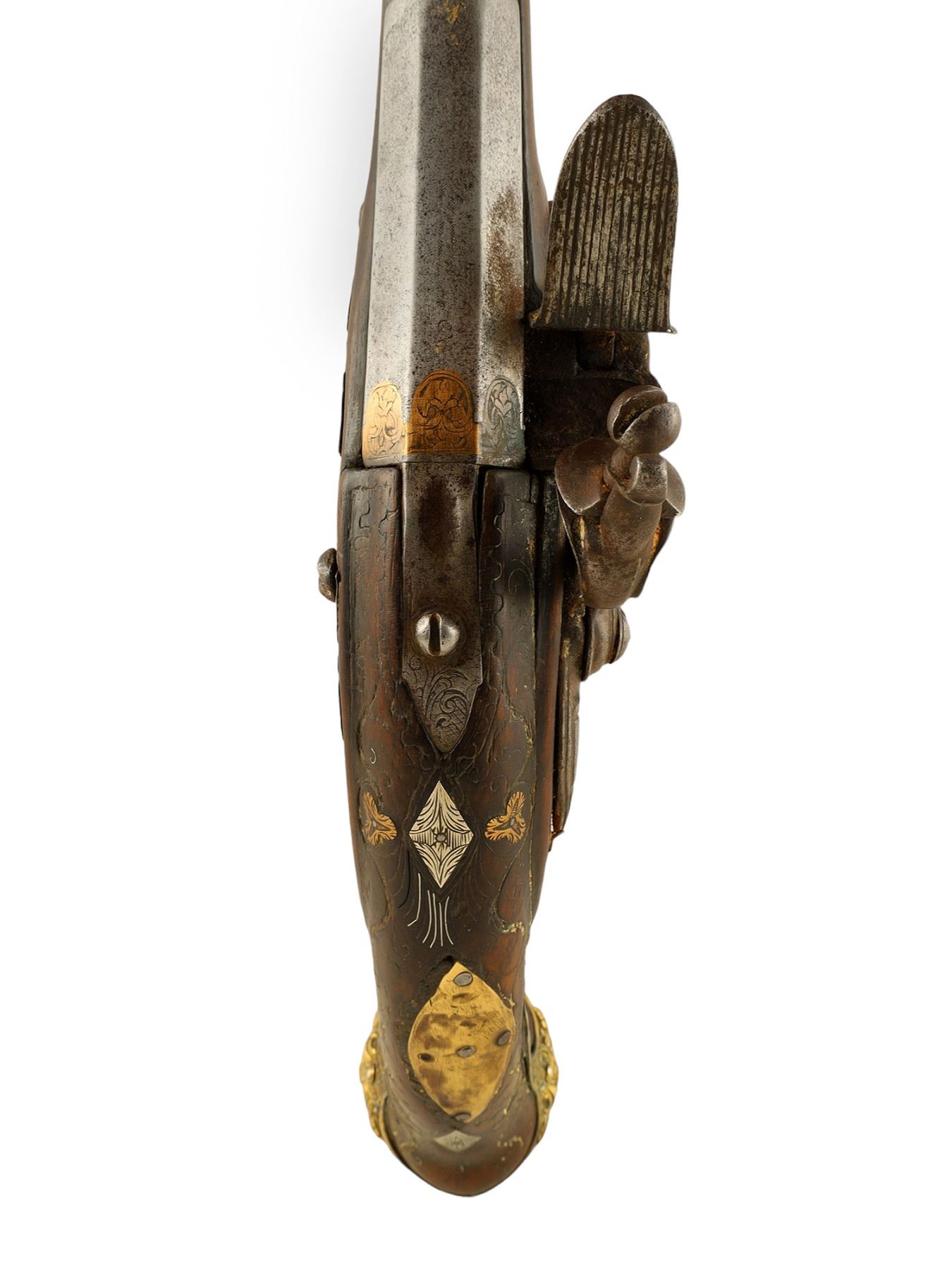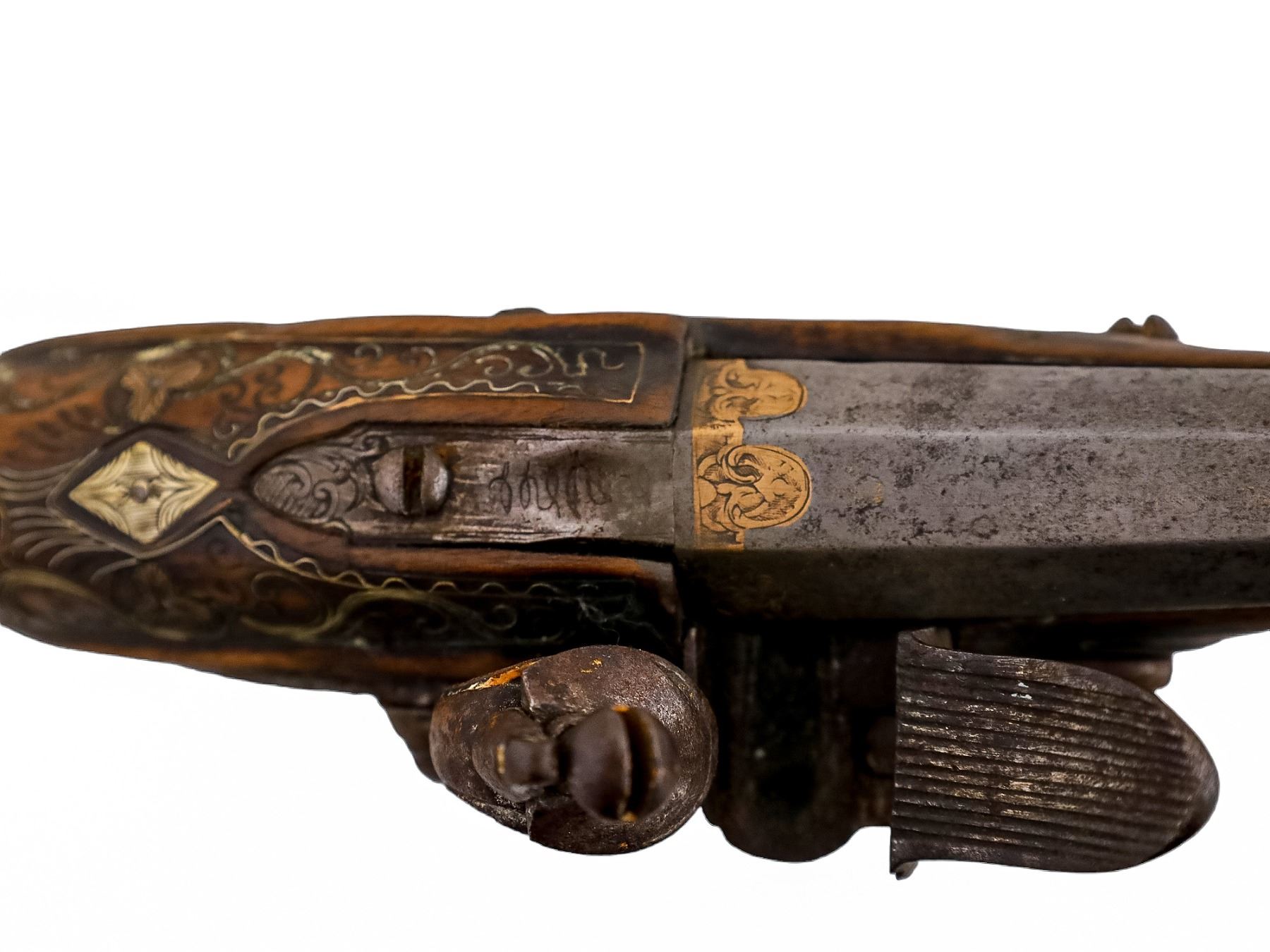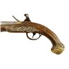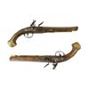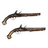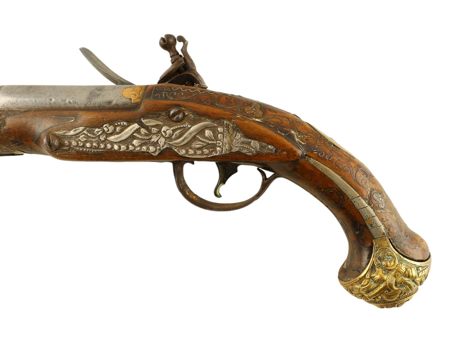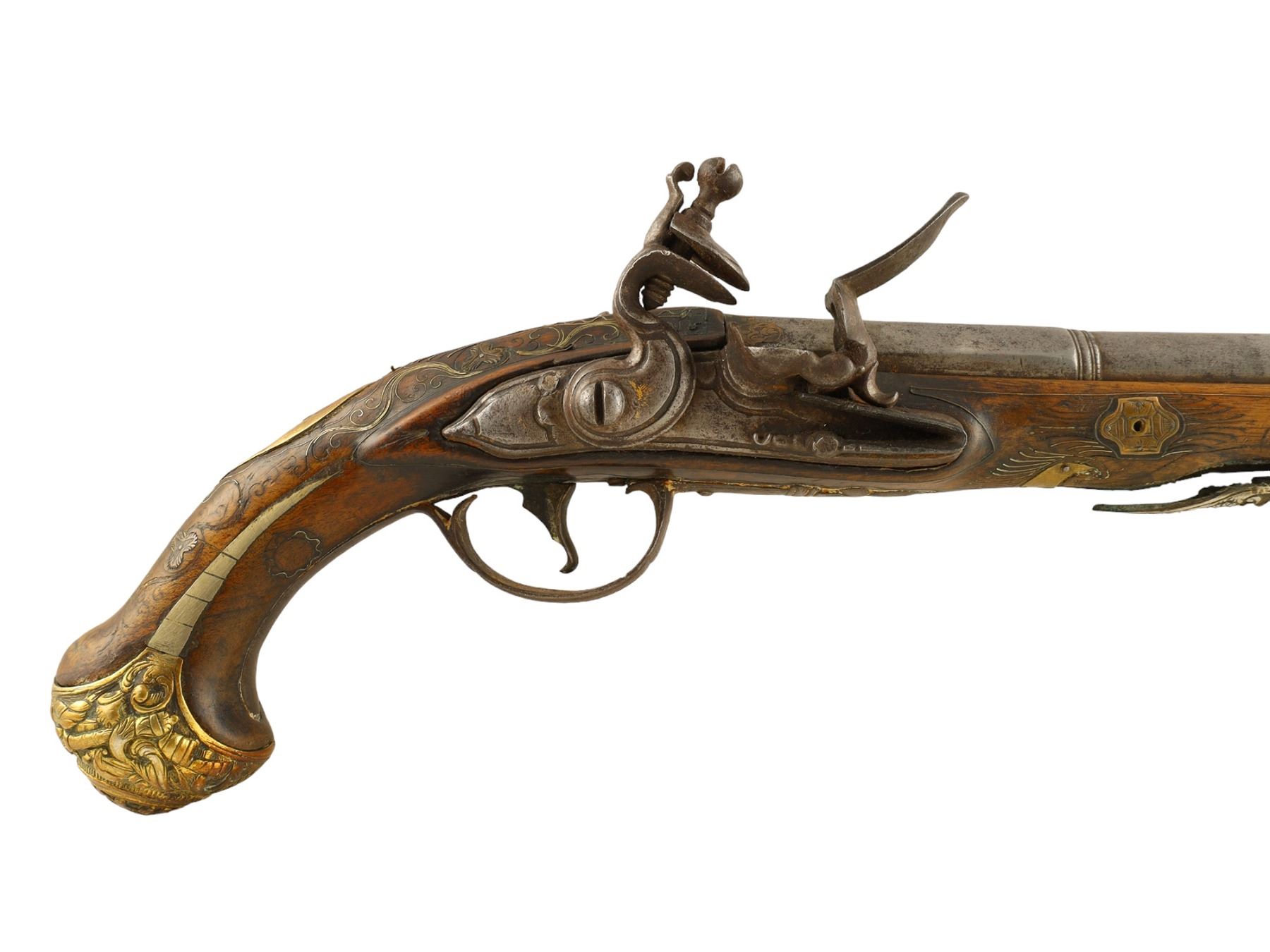 A pair of French flintlock pistols with round smoothbore barrel app. 18 mm cal. The octagonal breech part is inlaid with brass. The lockplates and triggers are decorated with fire gilt. The mounts are made of hammered and engraved brass. The stocks are decorated with brass inlay.