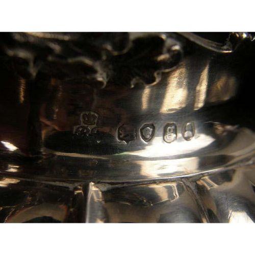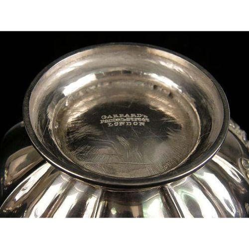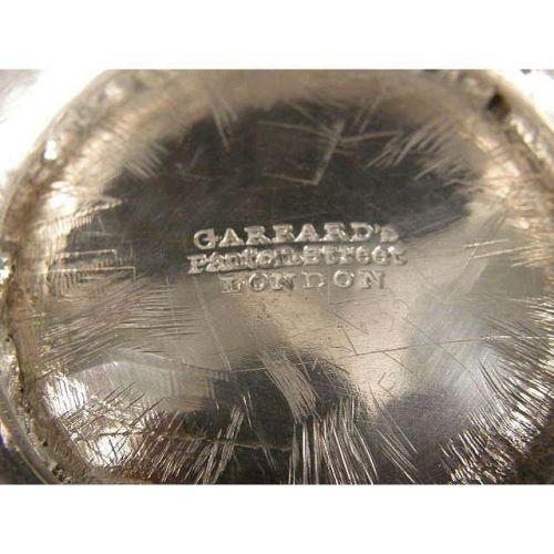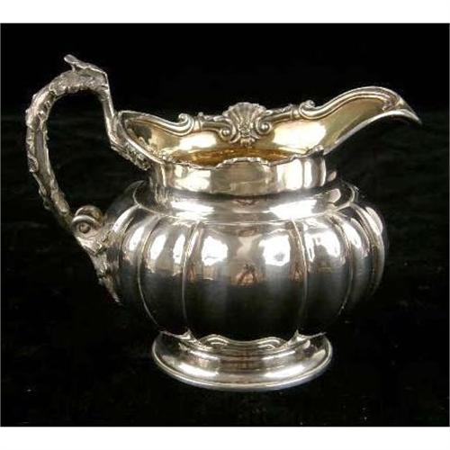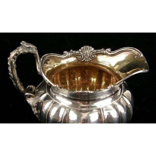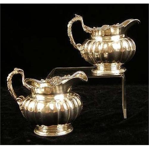 A PAIR OF GARRARD`S LONDON ENGLISH VERMEIL LINED STERLING SILVER FOOTED CREAM JUGS<BR><BR>Crested, hallmarked RG with a crown, London, 1822, with shell and scroll borders, leaf-form handles, ribbed globular form, 5-1/4"long over handle, 4-1/4"high, total weight 20 T.O.