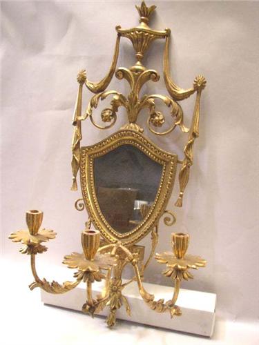 A PAIR OF GEORGE III STYLE CARVED AND GILDED PINE THREE-LIGHT WALL SCONCES; In the English tradition, each with urn finials, swags and flowerheads, above a mirrored shield issuing three candlearms, 33"h x 18"w, some wear