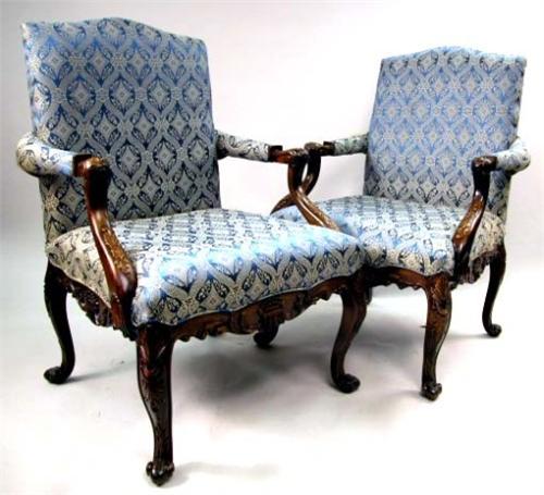 A PAIR OF GEORGE III STYLE CARVED MAHOGANY ARMCHAIRS; With serpentine shaped crest carved arm supports and ending on leaf carved cabriole legs and scrolled toes (minor areas or damage to upholstery) 40 1/2"h