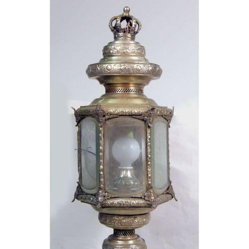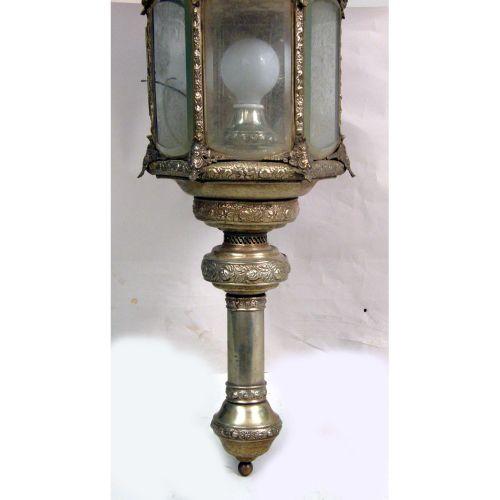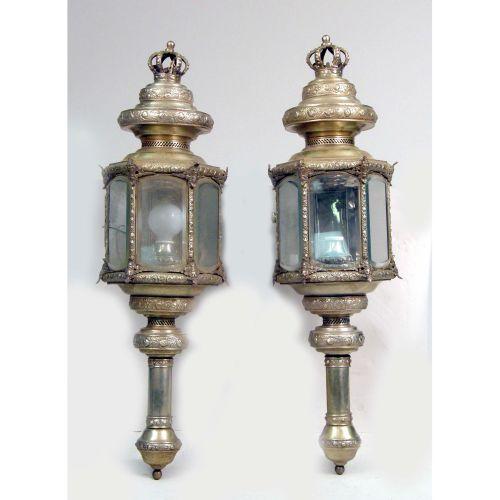 A PAIR OF GEORGIAN PATINATED METAL COACHING LANTERNS<BR><BR>Probably English, of impressive size, electrified, 39"h x 14"d