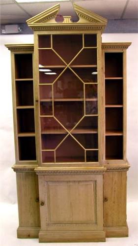 A PAIR OF GEORGIAN STYLE PINE PITCH-PEDIMENT BOOKCASES; with dentil moldings, glazed doors and plinth bases, 7'4"h x 45"w x 15"d