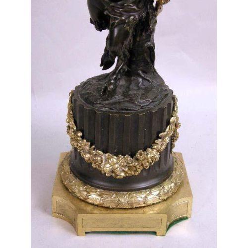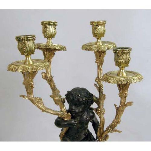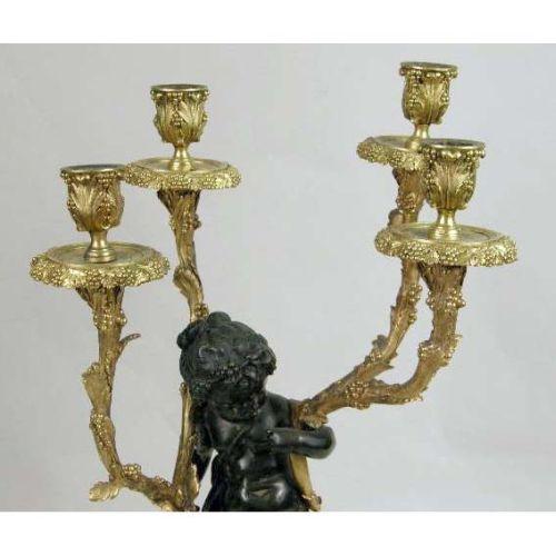 A PAIR OF GILT-BRONZE AND EBONIZED CLASSICAL-THEMED CANDELABRA<BR><BR>One depicting a young faun, the other a cherub, 21"h