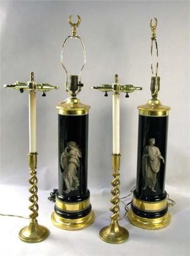 A PAIR OF GILT EGLOMISE TABLE LAMPS; cylindrical in form, featuring young maiden, together with a pair of brass barley twist candlesticks, each electrified. 30"h