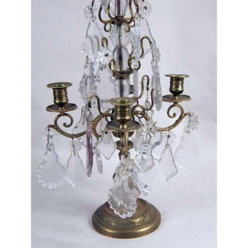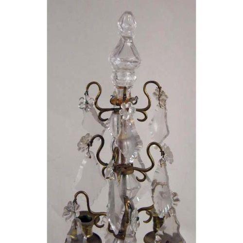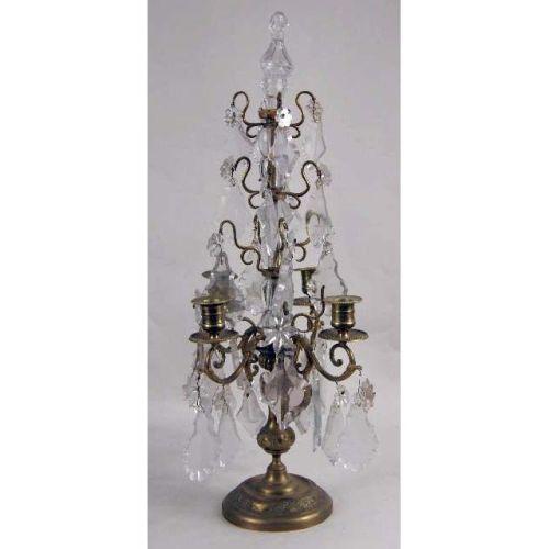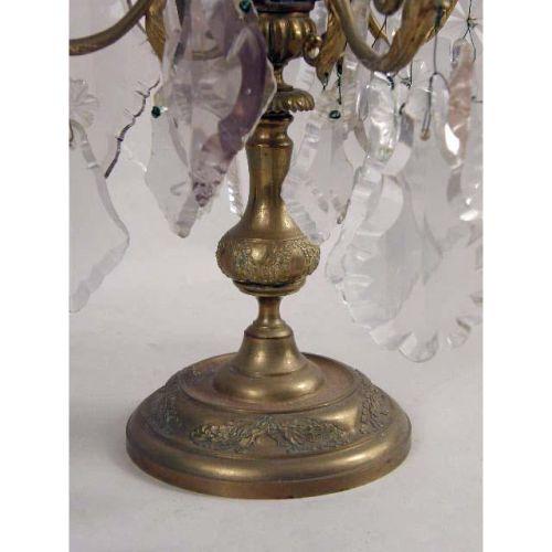 A PAIR OF GILT METAL AND CRYSTAL FOUR- LIGHT CANDELABRA<BR><BR>With cut drop prisms, 24-1/2"h