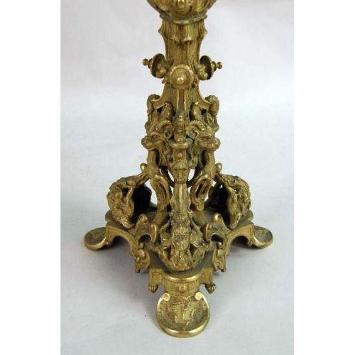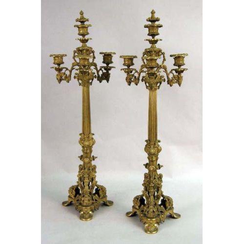 A PAIR OF GILT METAL VICTORIAN THREE LIGHT CANDELABRA<BR><BR>Grape and leaf drapery, 24"h