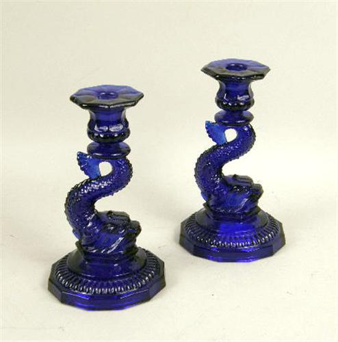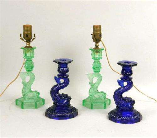 Now electrified. Together with a pair of similar replica cobalt blue dolphin candlesticks. 9 1/2"h