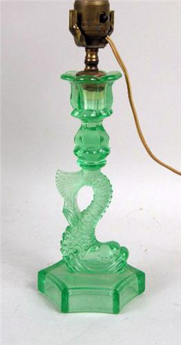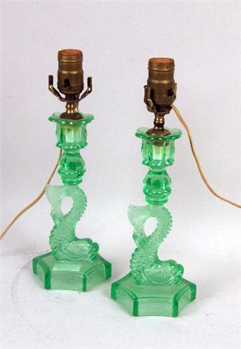 <b>A PAIR OF GREEN SANDWICH GLASS DOLPHIN-FORM CANDLESTICKS</b>