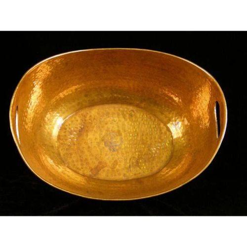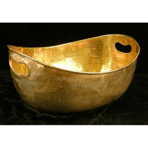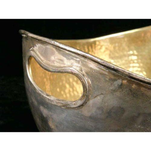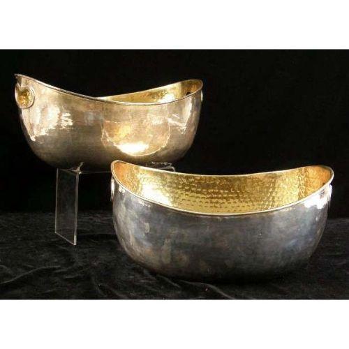 A PAIR OF HAND-HAMMERED SILVER PLATED HANDLED LARGE OVAL BOWLS<BR><BR>Inset handles, brass interiors, each 13`long