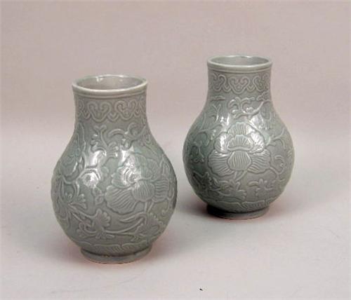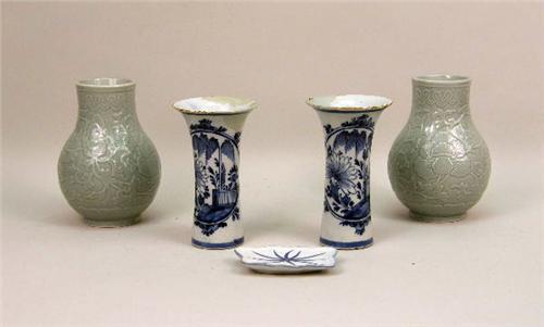 Together with a pair of 20th century celadon vases, and a Thai blue and white small dish. 8"h