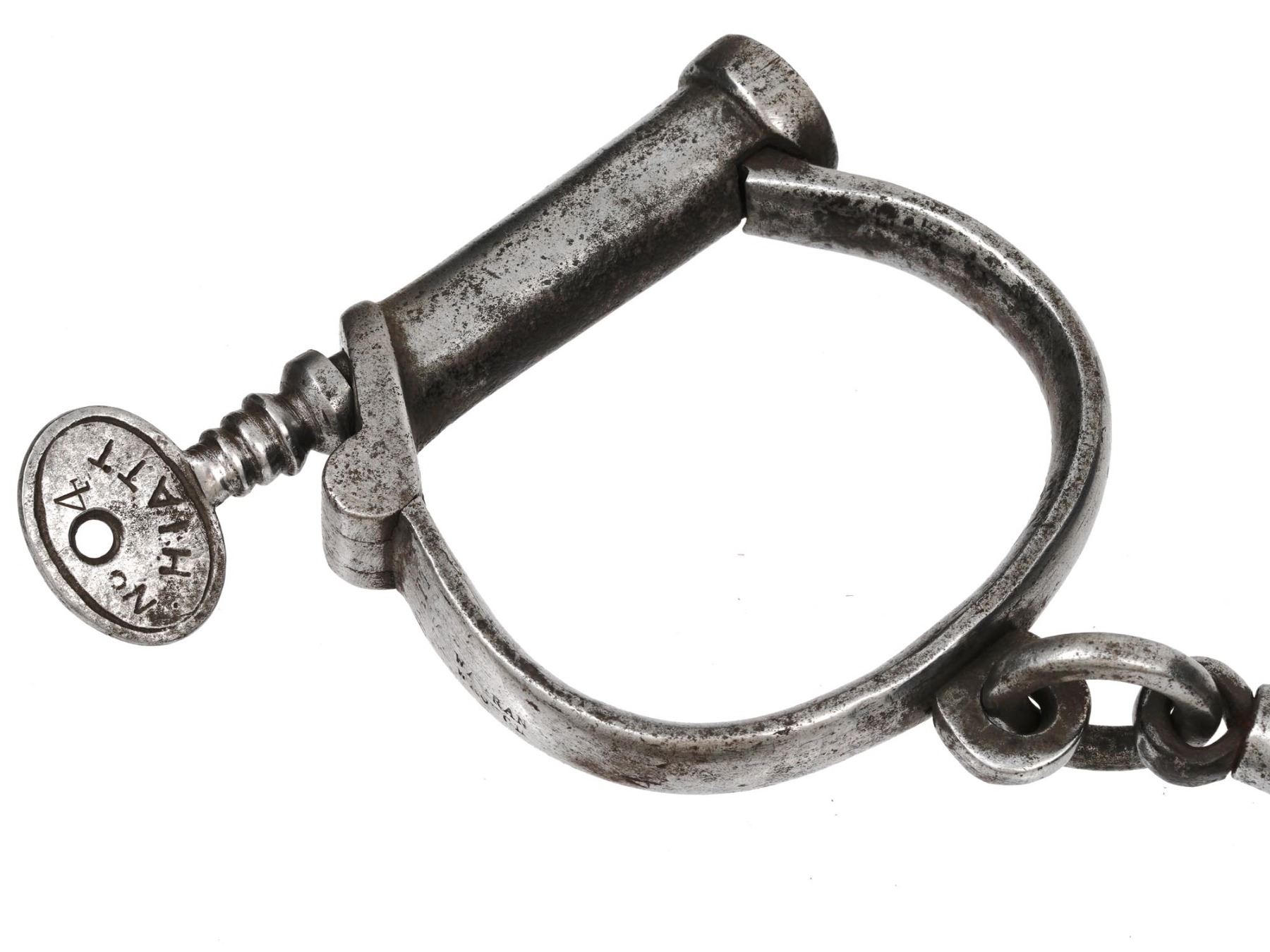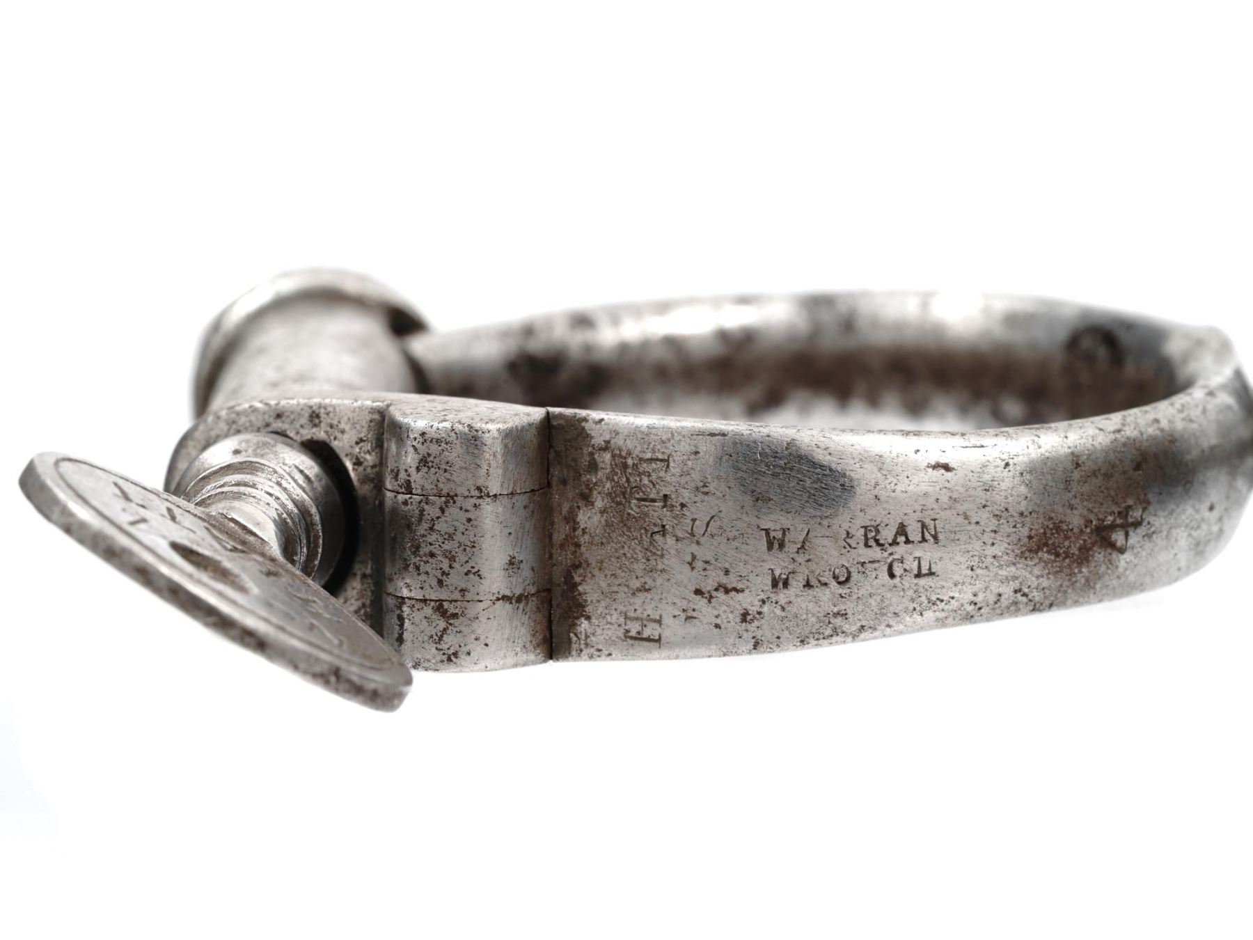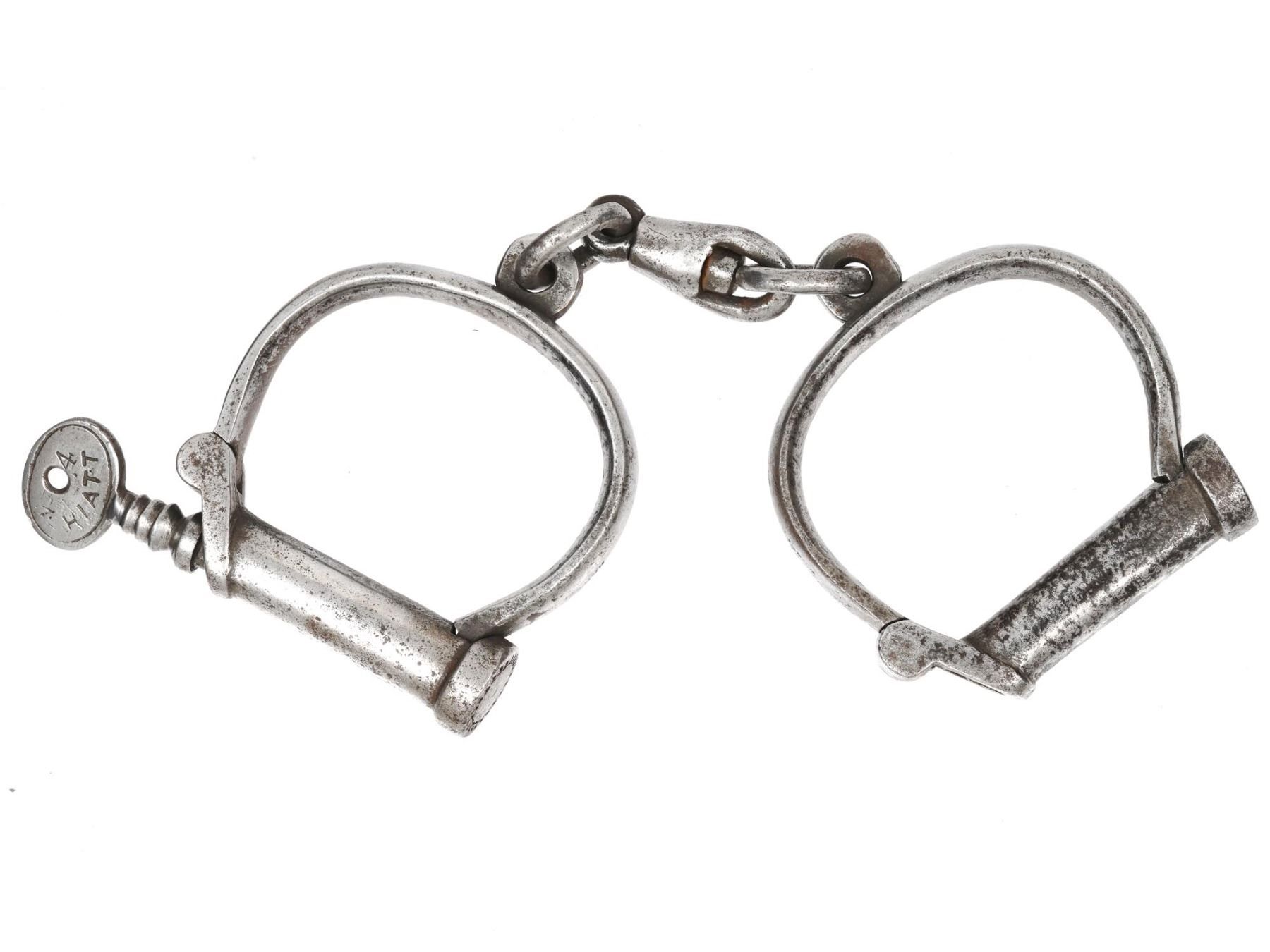 Hiatt steel handcuffs with broad arrow mark, stamped "Hiatt, Warranted, Wrought, Hard", # 4, with original key stamped "HIATT # 4".